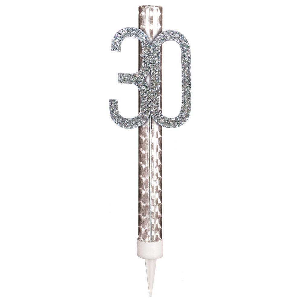 Sølv Isfakkel med Tallet 30 er en isfakkel med holografisk sølvfarge og tallet 30, dekorert med sølvfargede strass.
