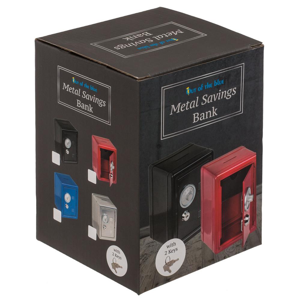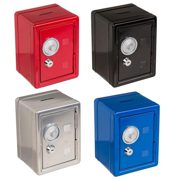 Sparebøsse Pengeskap 12 x 10 x 16 cm omfatter et lite pengeskap i metall med både kombinasjonslås, nøkkellås og et myntinnkast på toppen. Vær oppmerksom på at kombinasjonslåsen ikke fungerer som en tradisjonell lås, men heller som et håndtak, og at den kun består av ett siffer. Dette sifferet er forhåndsinnstilt og angis på en lapp på baksiden av pengeskapet. Sparebøssen finnes i fargene svart, rød, blå og sølv.