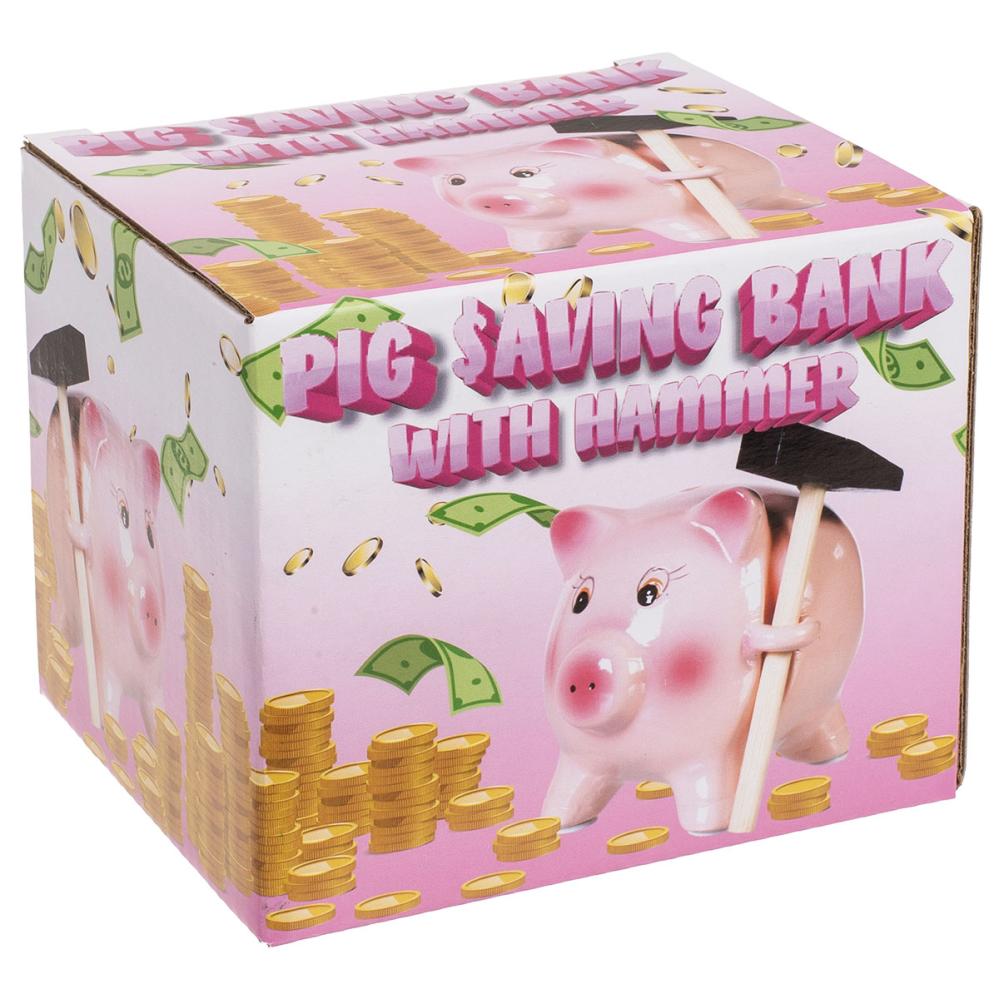 Sparegris med Hammer 13 x 10,5 cm omfatter en sparebøsse i form av en rosa gris som holder en avtakbar hammer i svart og brunt. For å få ut pengene må sparebøssen slås i stykker med hammeren, da den mangler åpning på undersiden.