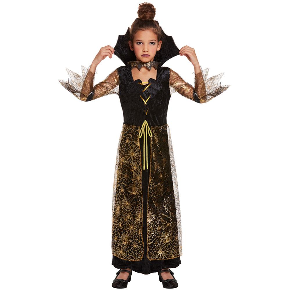 Spiderella Kostyme Barn omfatter en svart kjole som er laget i et filtlignende materiale med snøring foran. Kjolen har nettingstoff med gullfarget og sølvfarget spindelvevmotiv på kjolens nedre del samt over armene. I tillegg følger det med en stor, svart krage med gullfarget spindelvevmotiv rundt halsen.