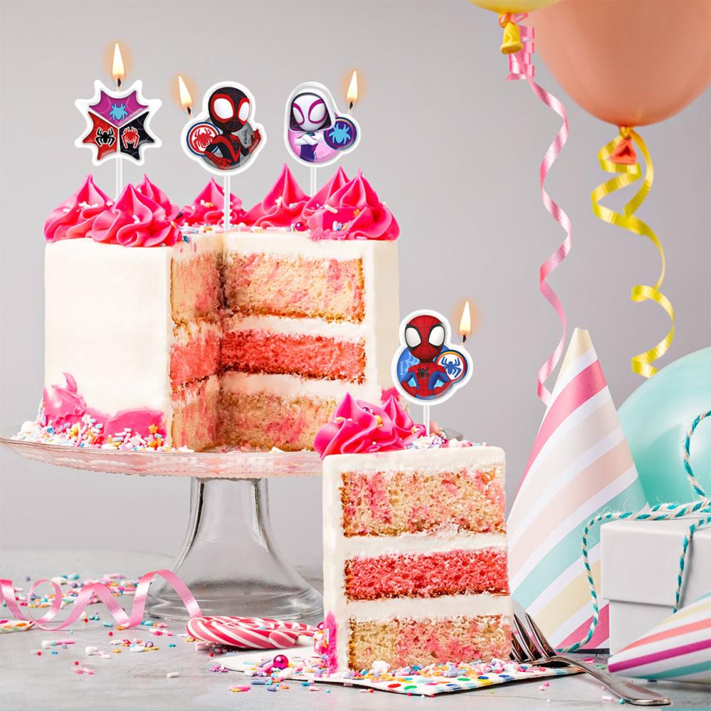 Gjør bursdagen ekstra morsom med kakelys med Spidey-tema. Denne 4-pakningen er en perfekt kakepynt til barnebursdag og prydes av Spidey, Ghost-Spider, Spin samt deres kule logoer.