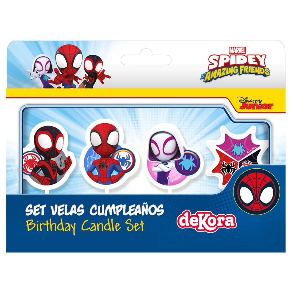 Spidey og Venner Kakelys 4-pakning omfatter en pakke som inneholder 4 stk kakelys med motiv av Spidey, Ghost-Spider, Spin samt et lys med deres logoer. Lysene har også en hvit plastpinne nederst som gjør det enkelt å sette lysene på plass i kaken.