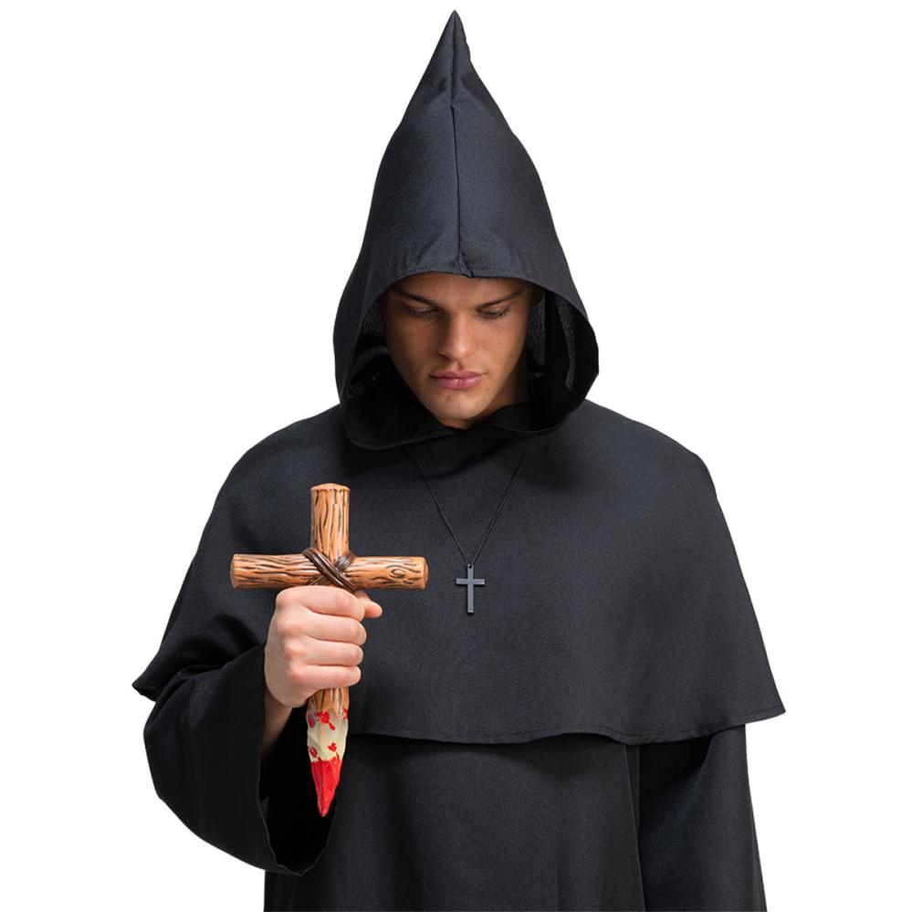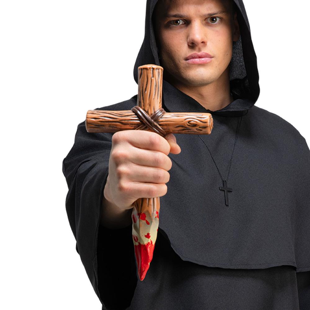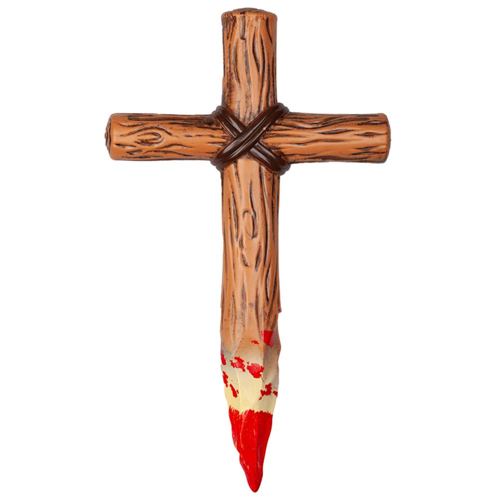 Dette Halloween vampyrkorset er et blodig kors med et treutseende og en skrekkinnjagende detalj på spissen. Perfekt som en Halloween borddekorasjon eller som et skummelt kostymetilbehør til vampyrtemaet.