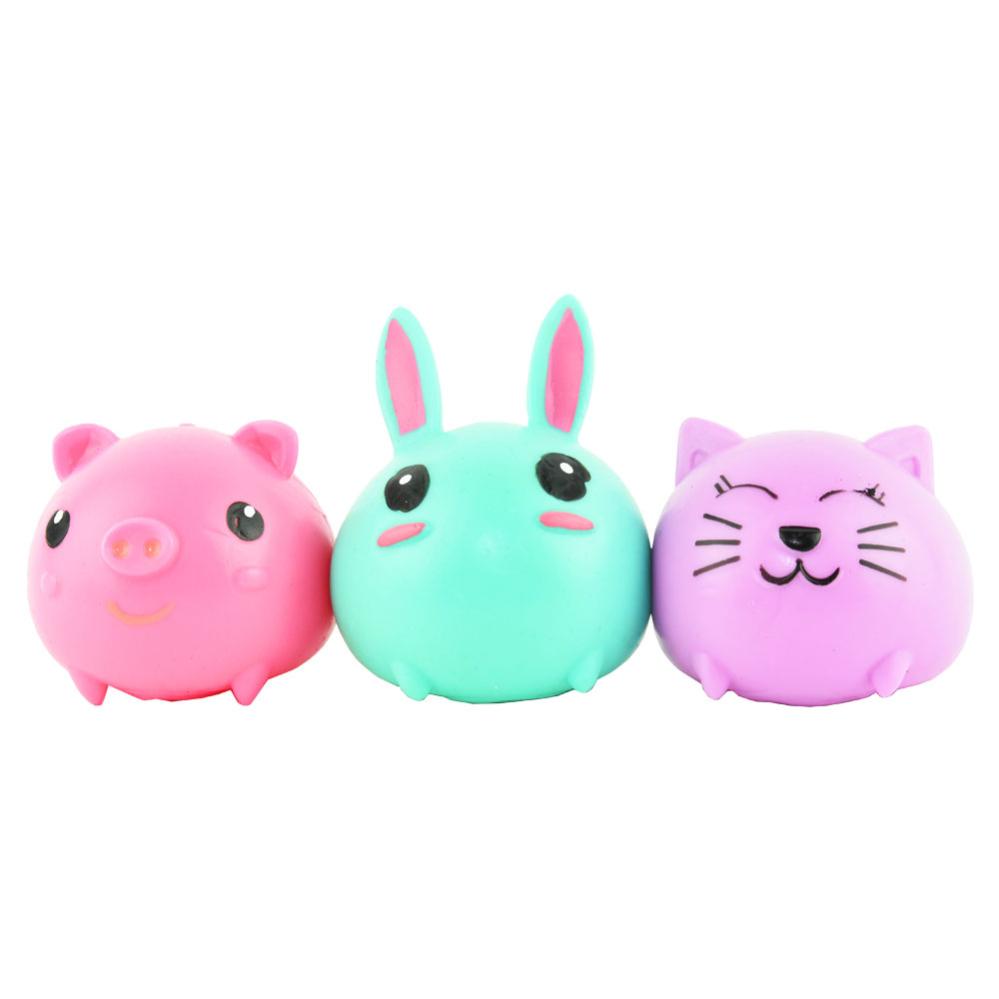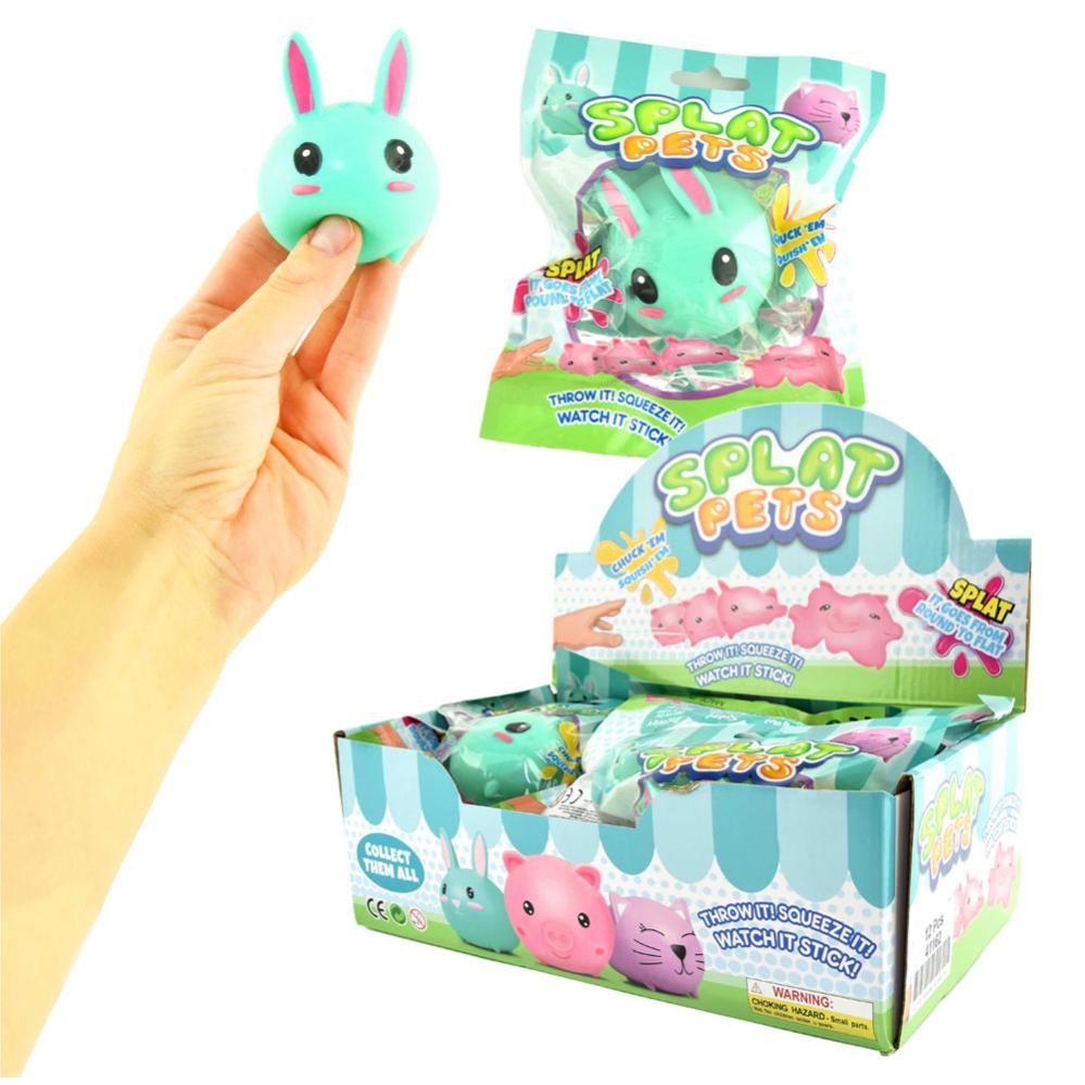 Splat Ball Dyr omfatter en morsom stressball i form av et søtt rundt dyr som blir flat når du kaster den på gulvet eller på veggen, og som deretter går tilbake til sin opprinnelige form. Splatballen er ca 6 cm stor og finnes som rosa-lilla katt, turkis kanin eller rosa gris, hvilken du får blir en overraskelse.