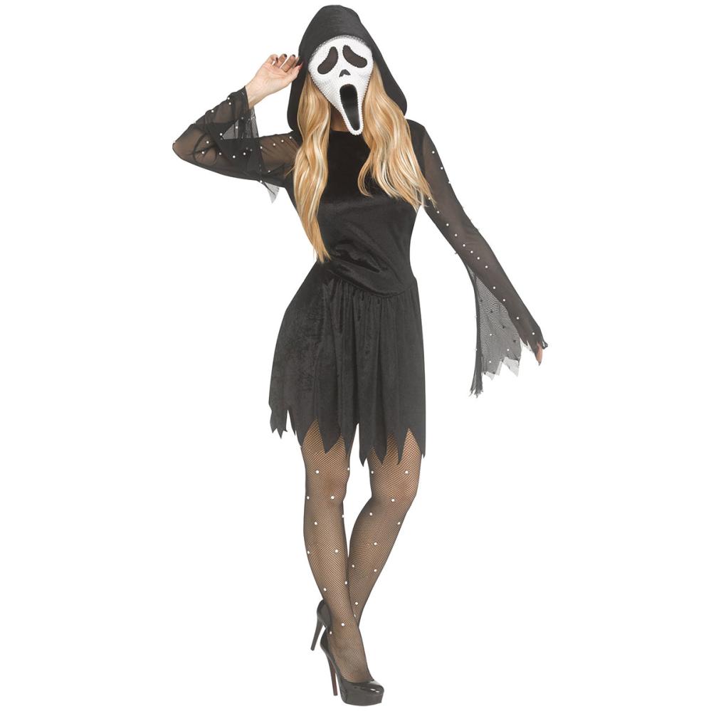 Spøkelse Kostyme Perler er et kostyme med motiv av et spøkelse fra Scream. Drakten inneholder en svart kjole med taggete kanter og lange ermer dekorert med hvite perler samt en hvit maske med hvite perler. Masken har en myk skumpute ved pannen og et svart elastisk bånd som holder den på plass.