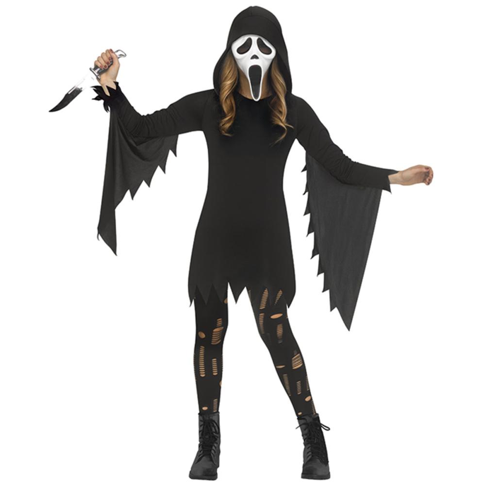 Spøkelse Kostyme Svart/Hvit Barn er et kostyme med motiv av et spøkelse fra Scream. Kostymet inneholder en svart kjole med lange ermer og taggete kanter samt en hvit maske som har en myk skumpute ved pannen og et svart elastisk bånd som holder den på plass.