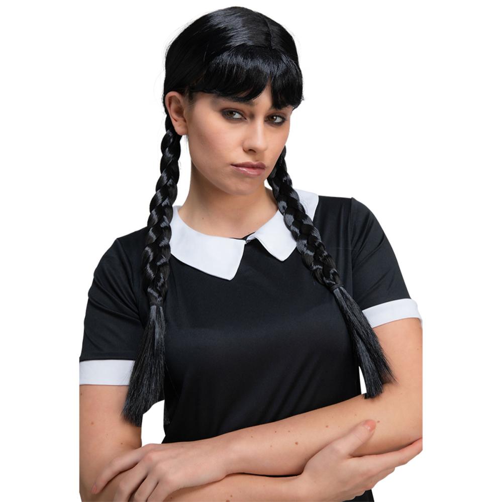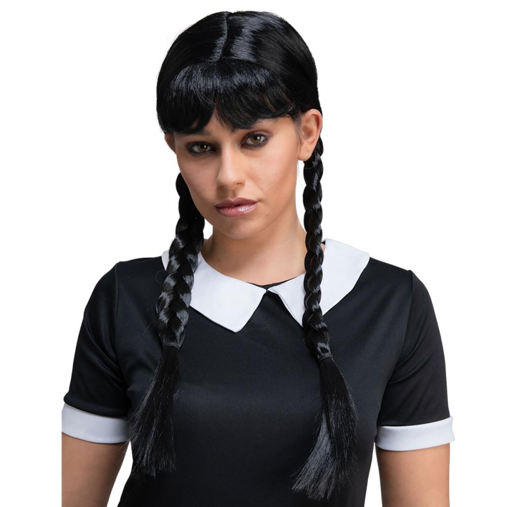 Fullend utkledningen din som Wednesday med denne mørke og stilfulle parykken med fletter. Med fine fletter og lugg passer den perfekt til Familien Addams maskerade eller som en klassisk Wednesday Halloween parykk.