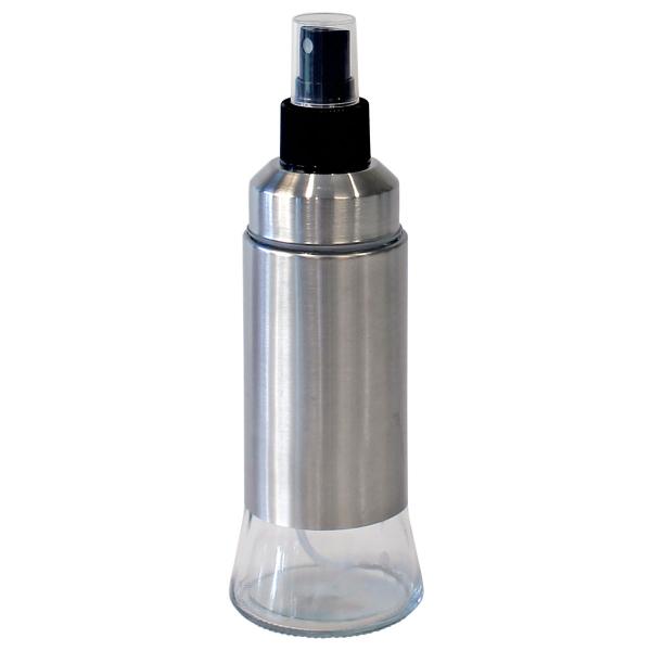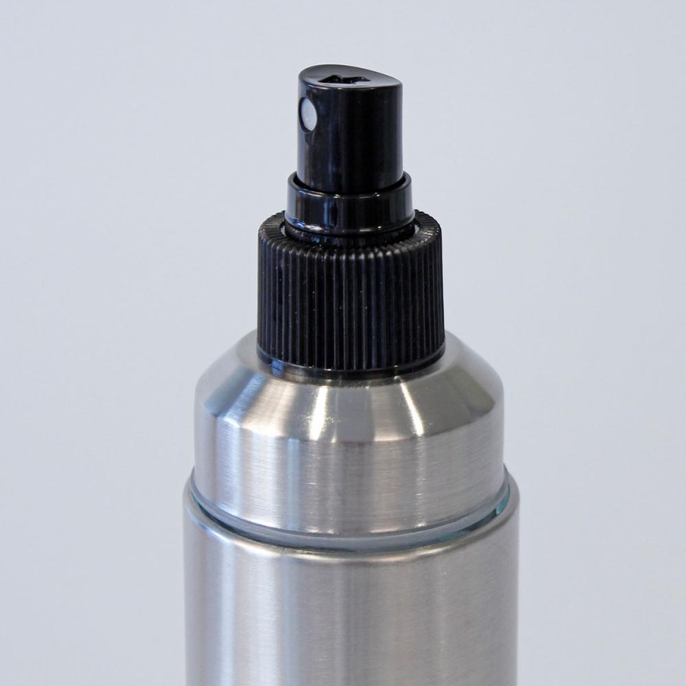 Sprayflaske for Olje/Eddik 19 cl består av en stilren flaske i sølvfarget metall med svart spraykork og beskyttelseslokk. Den nedre delen av flasken er laget av transparent glass, noe som gjør det enkelt å se innholdet.