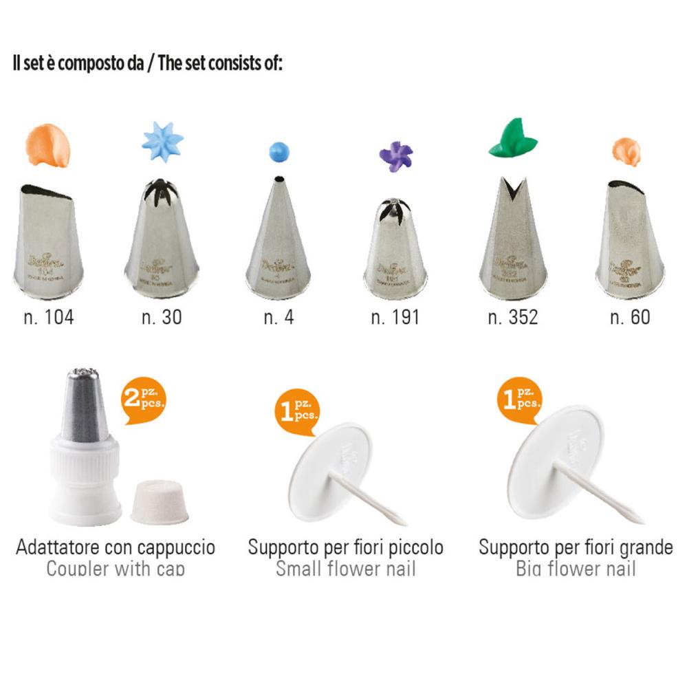 Dette sprøytesettet med tyller, tyllkoblinger og blomsternåler er perfekt for både nybegynnere og erfarne kakedekoratører. Med sprøytetyller i ulike former og størrelser kan du skape detaljerte mønstre for et profesjonelt resultat.