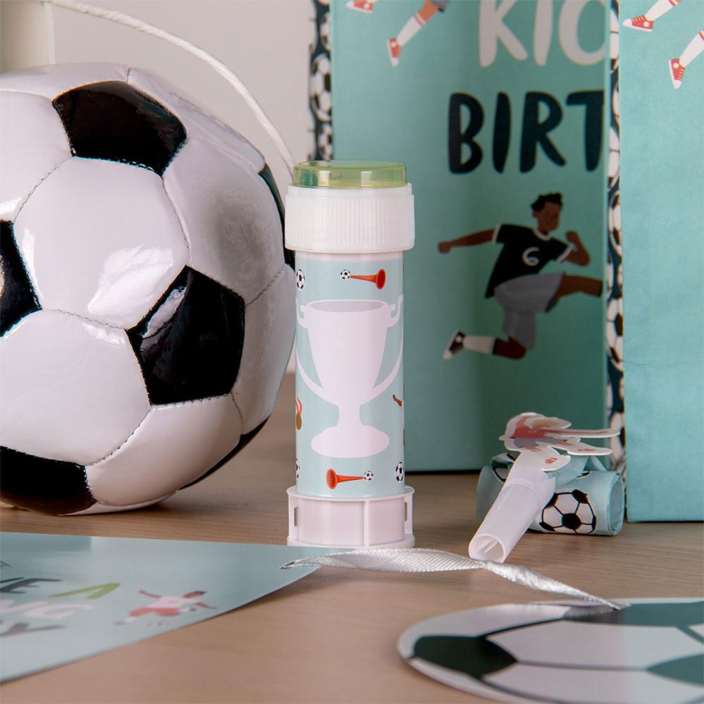 Gjør barnas fotballtemabursdag enda festligere med disse såpeboblene som barnebursdagstilbehør. Seks stickers med fargerike fotballmotiv blir lekne og personlige bursdagstilbehør.
