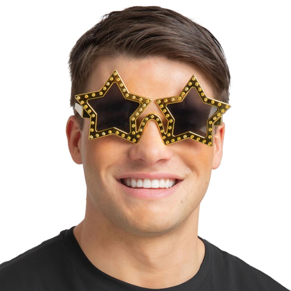Stjerneformede Briller Gull omfatter et par stjerneformede briller med en gullfarget innfatning.