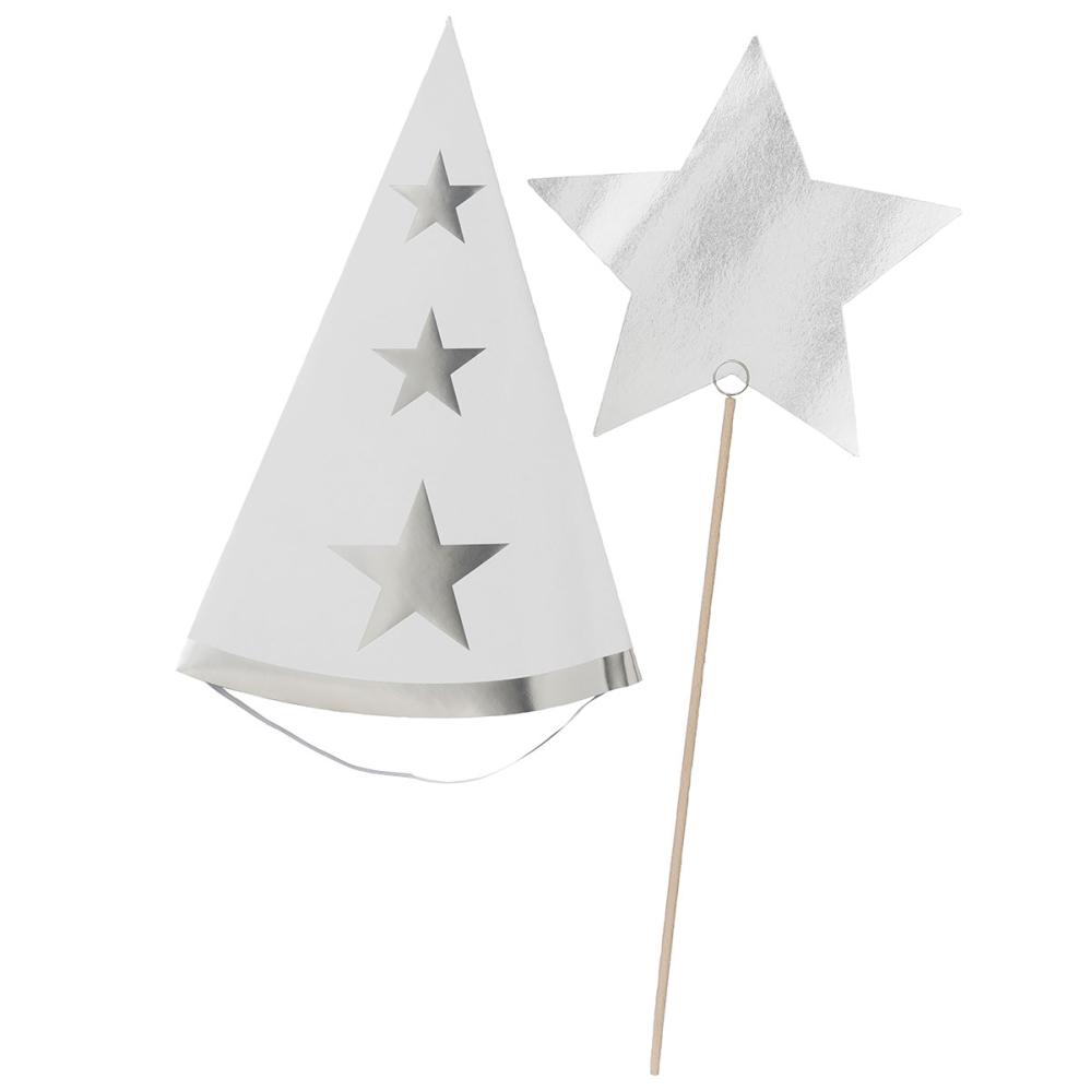 Stjernegutt Hatt med Stjerne omfatter et stjerneguttsett med en sølvfarget stjerne og en hvit spisshatt med sølvfargede stjerner. Kitet passer barn, men også voksne.
