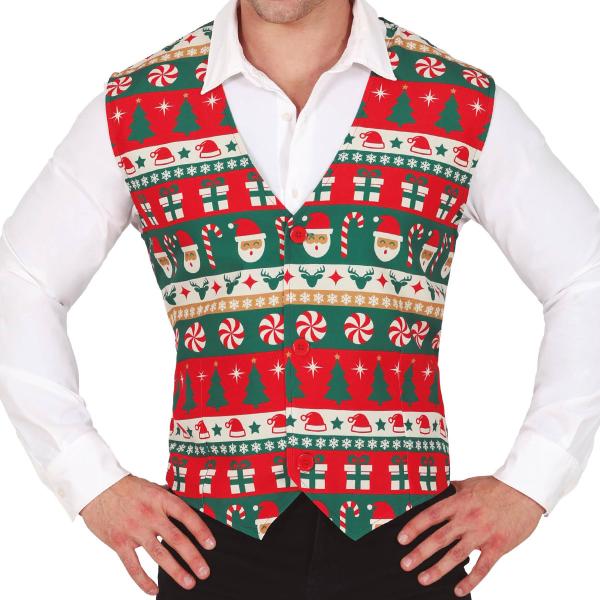 Stick deg ut i vintermylderet med en julete vest full av klassiske symboler. Denne julevesten for herrer har alt fra julenisser til polkagriser og er en perfekt vest med julemotiv til festen eller kontoret.