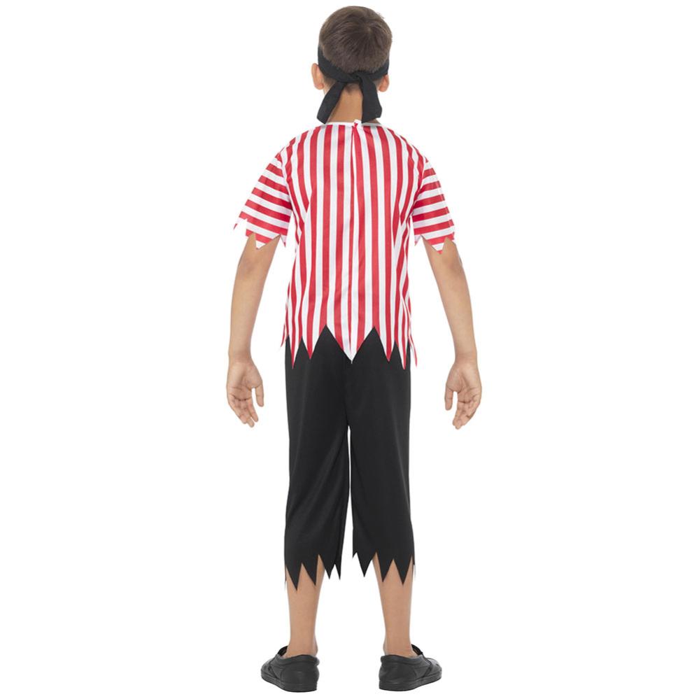 Stripete Piratkostyme Barn omfatter et barnekostyme med en bandana, en svart øyelapp, svarte bukser og en stripete T-skjorte i hvitt og rødt med et svart piratskip trykket foran.