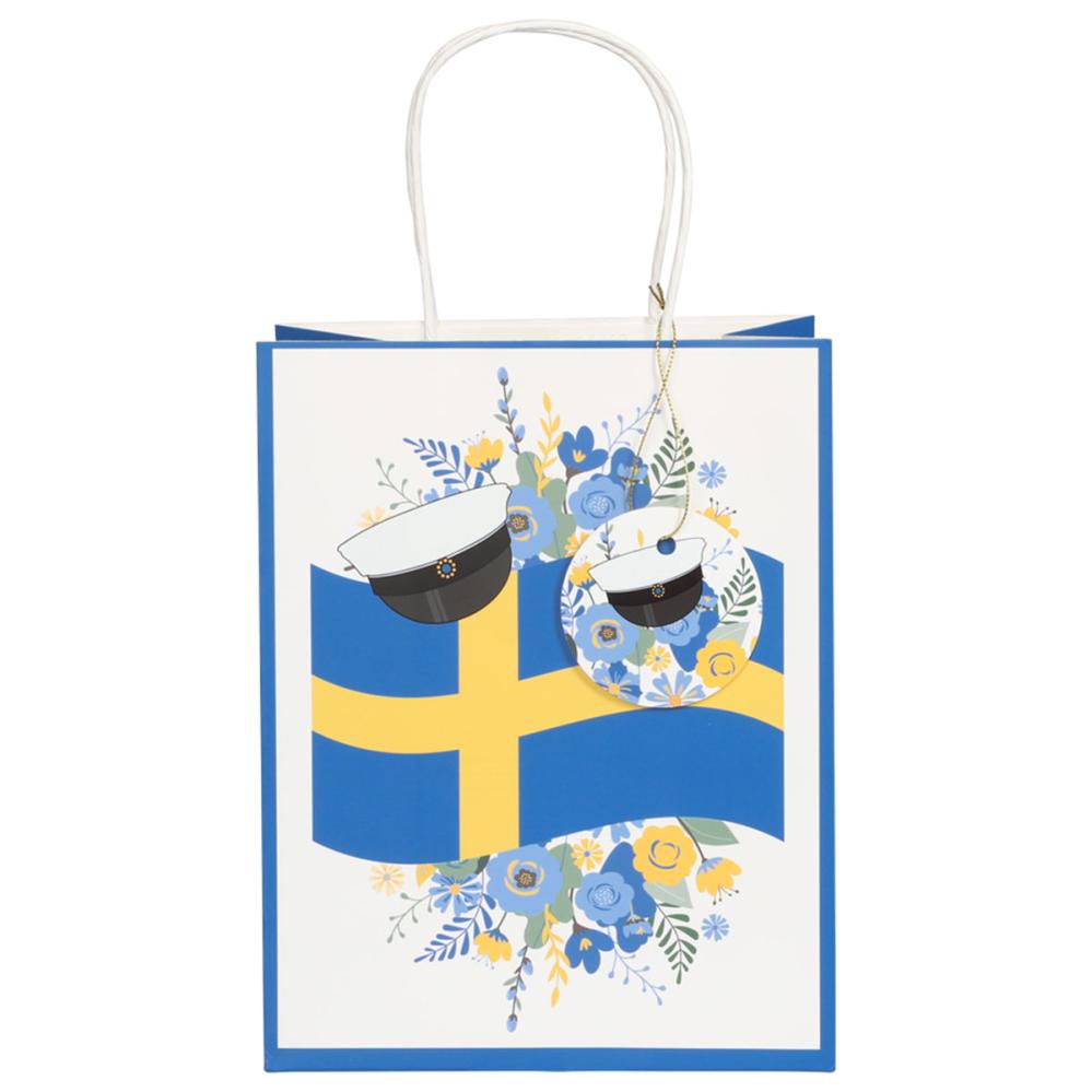 Student Gaveopse Svenske Flagget 18 x 10 x 23 cm er en hvit gavepose med det svenske flagget, blomster, en klassisk studentlue og en blå kant rundt. Posen har blå sider, hvite bærehåndtak og en hvit rund etikett med blomster og en studentlue som har en gullfarget snor.