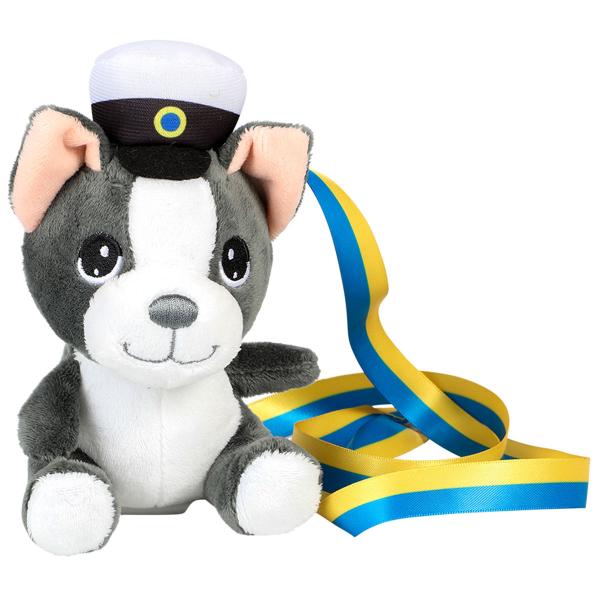 Studentbamse Hund Hvit/Mørkegrå 15 cm er en studentbamse i form av en hund i hvitt og mørkegrått med en studentlue. Et blågult bånd med borrelåslukking følger med slik at studentbamsen kan henges rundt halsen.