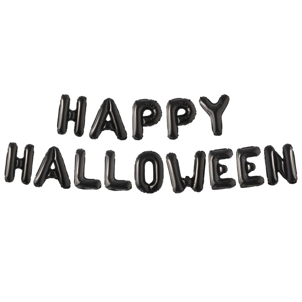 Svart Ballonggirlander Happy Halloween inneholder fjorten svarte bokstavformede folieballonger som danner teksten ”HAPPY HALLOWEEN”. Ballongene fylles med luft med det medfølgende blåserøret og har hemper for enkel oppheng med den hvite snoren som følger med.