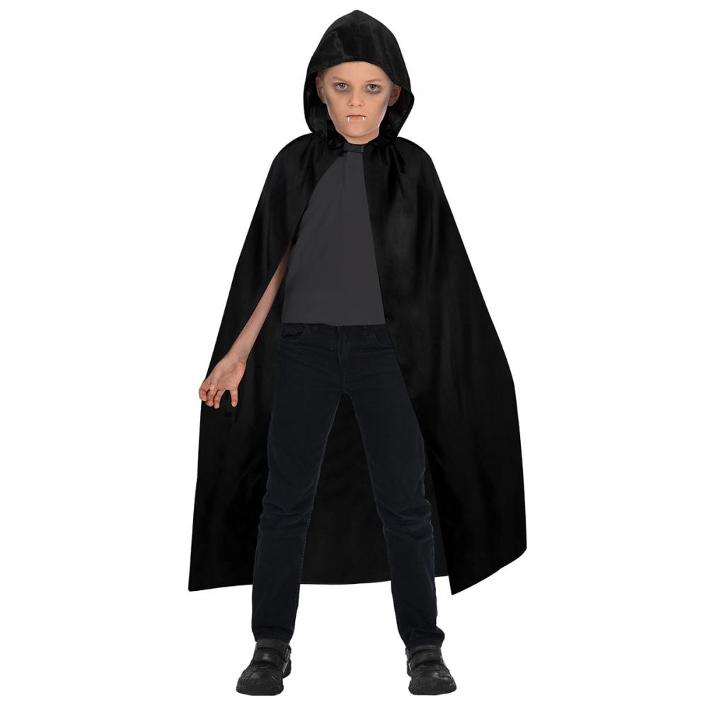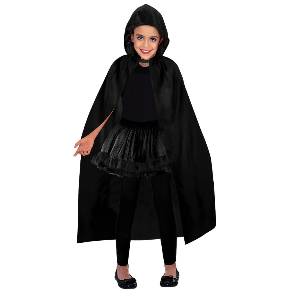 Forvandle barnets stil med en svart Halloweenkappe med hette, som enkelt festes med borrelås. En svart kappe for barn er perfekt å bruke som vampyrkappe eller karnevalskappe til Halloween, både til lek og fest.