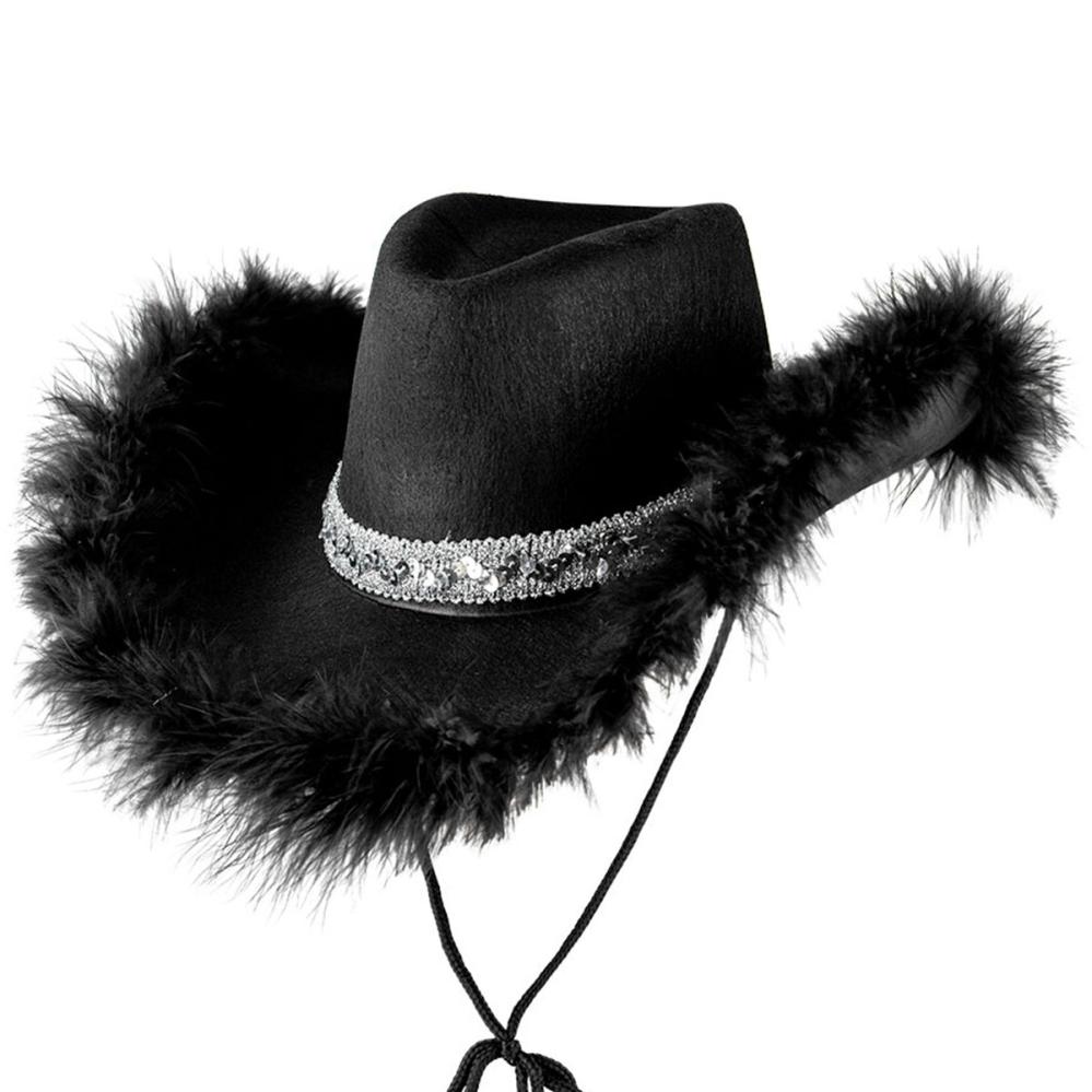Svart Cowboyhatt med Fjærkant omfatter en svart westernhatt i et filtlignende materiale som har et sølvfarget bånd med paljetter og svarte maraboufjær rundt kanten. Hatten kommer med en snor som strammes under haken for en perfekt passform.