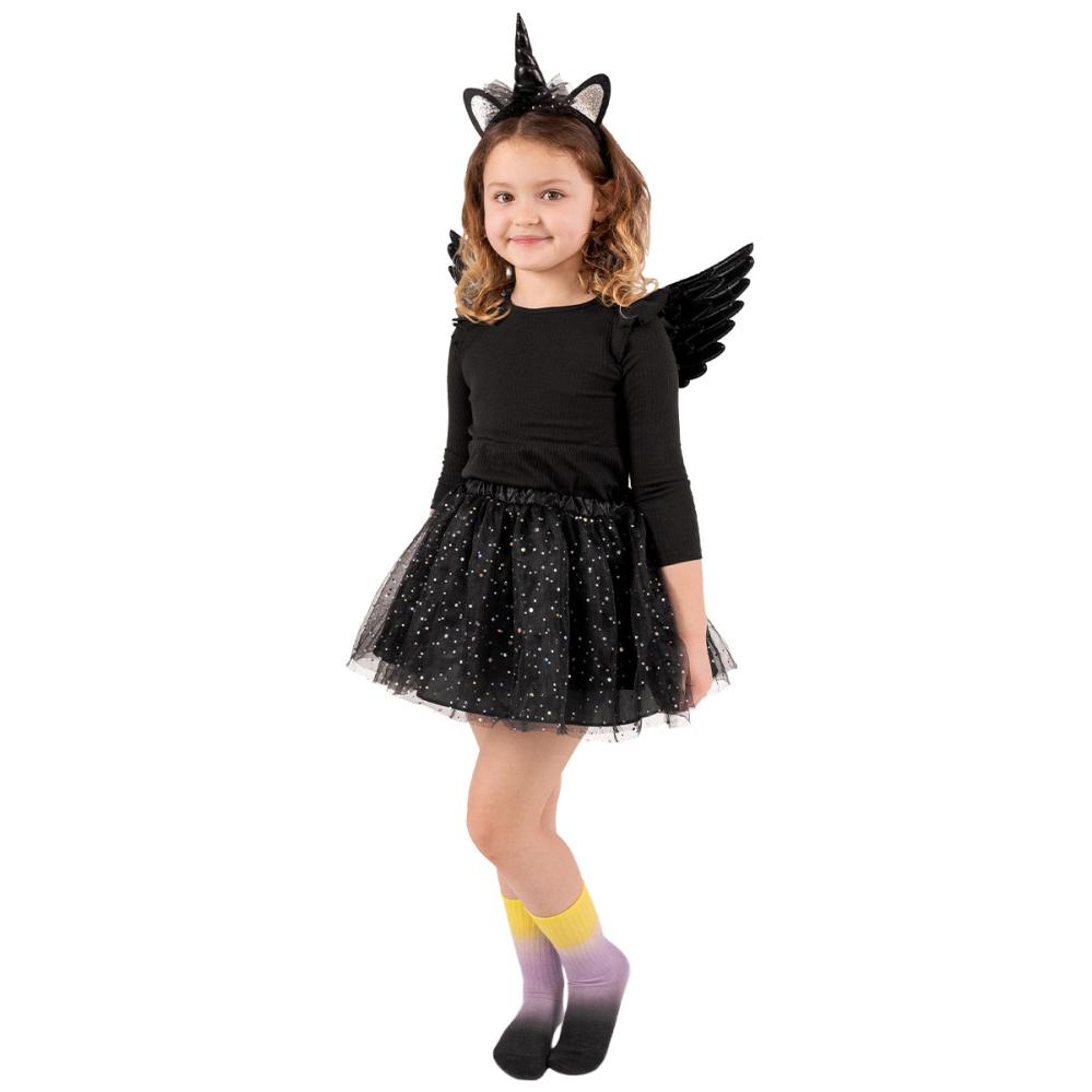 Gjør suksess på neste fest med enhjørning-tema med dette magiske enhjørningskostymet for barn. Med svart tyllskjørt, horn og vinger blir det et perfekt enhjørningskostyme til fantasifulle leker og festligheter.