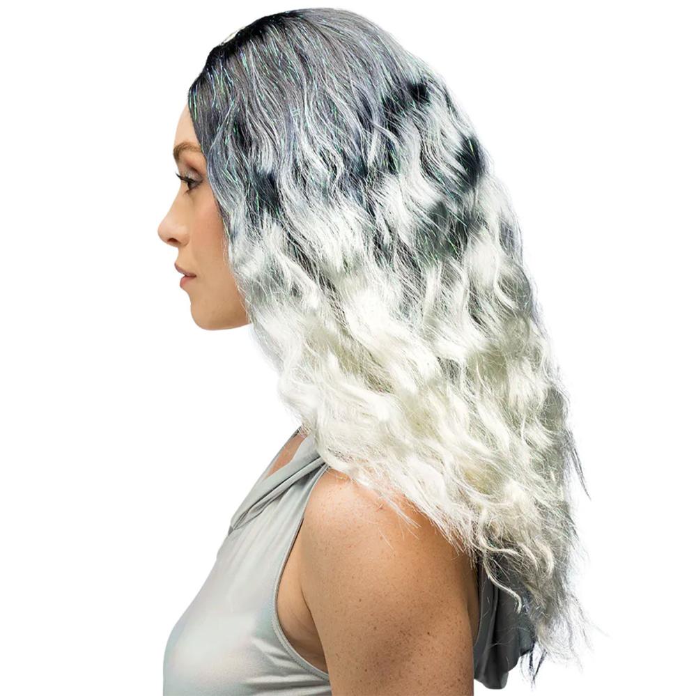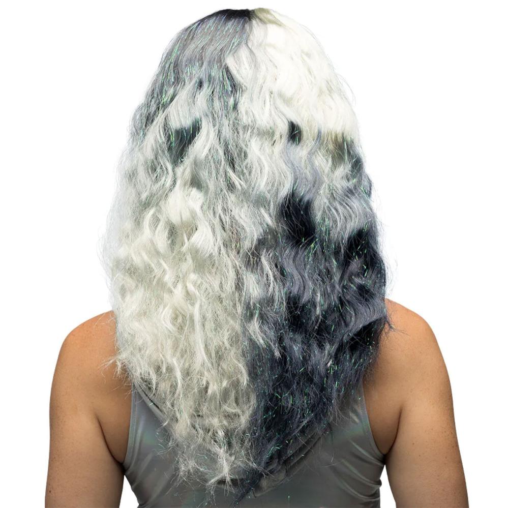 Skill deg ut på en Disney-temafest med denne svart og hvit parykken som gir assosiasjoner til Cruella de Vil. Dette er en perfekt Halloween-parykk med glamorøse glitterstriper som gjør hver bevegelse magisk skimrende.