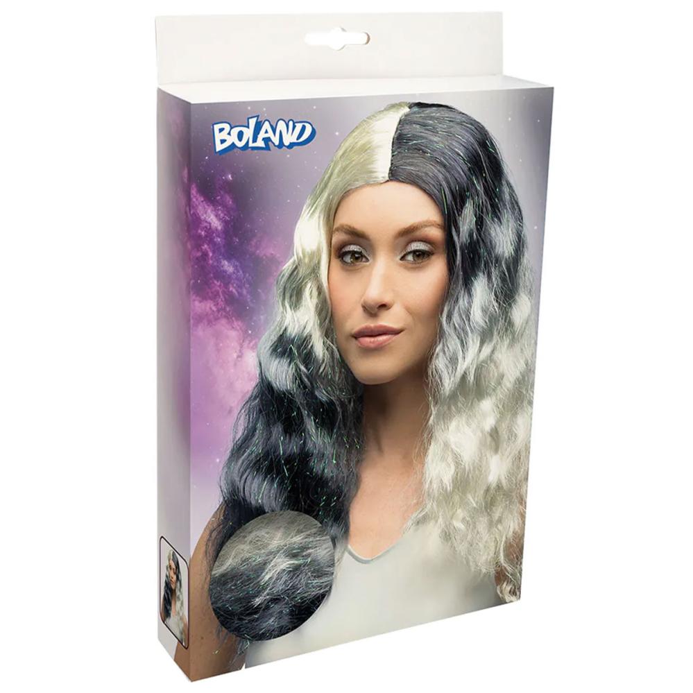 Info om Svart og Hvit Parykk med Glitterstriper:
