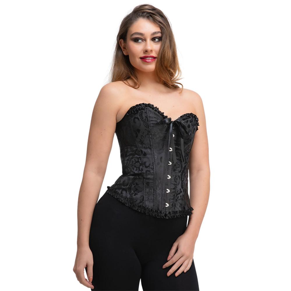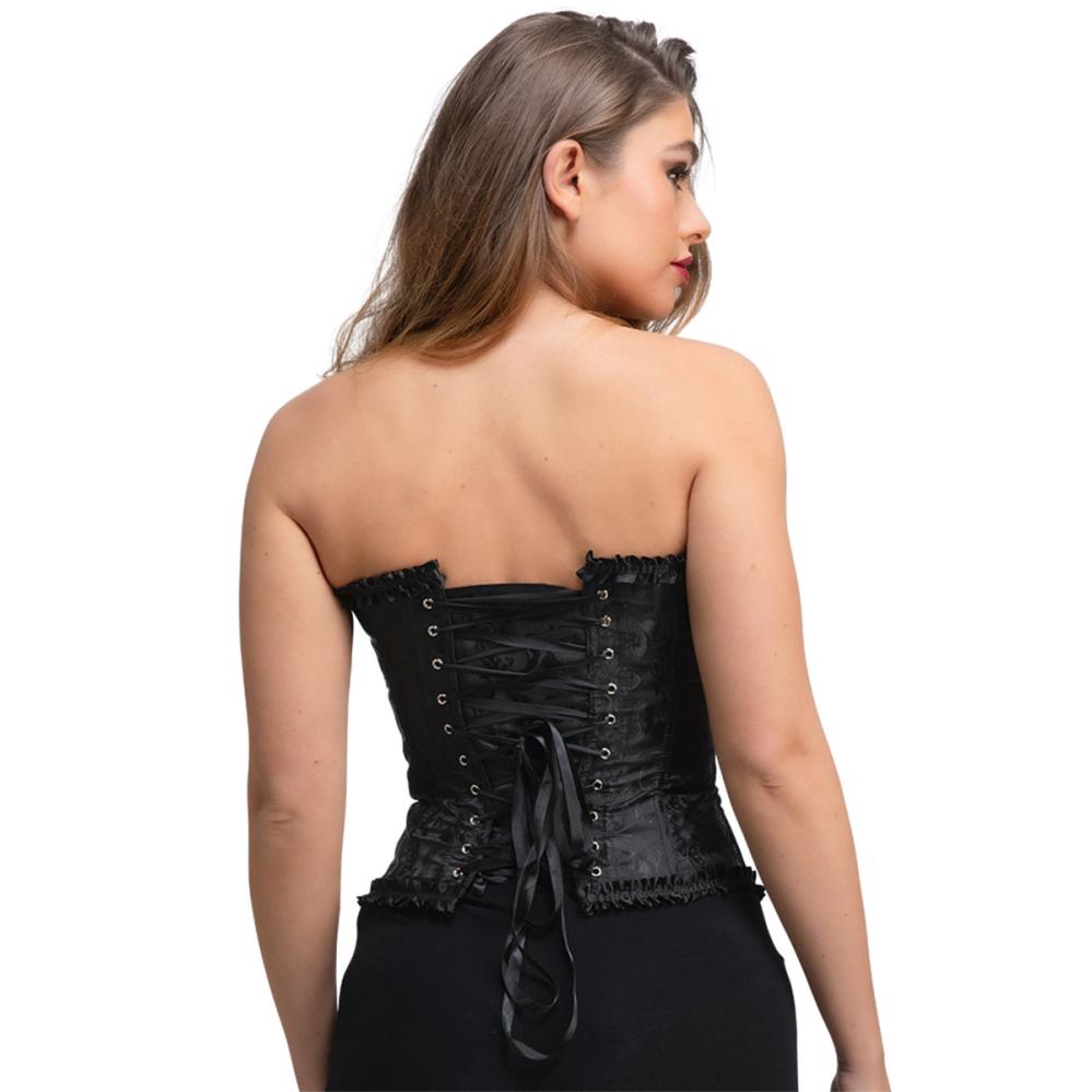 Denne svarte satengkorsetten kombinerer stil og komfort med sin elegante snøring bak for perfekt passform. En korsett med snøring som passer både til fest og som utkledning til maskerade med sine særpregede detaljer.