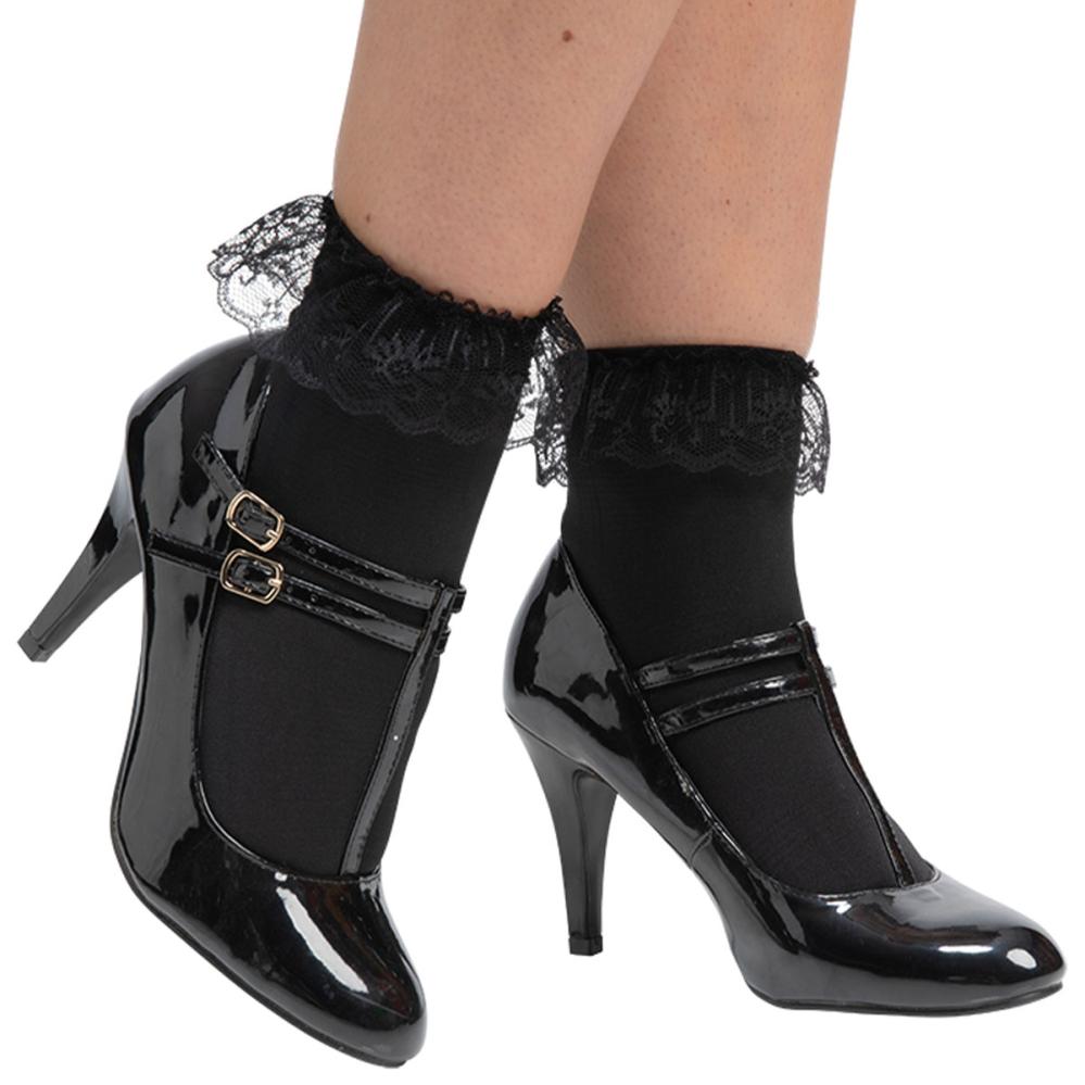Svarte Sokker med Blonder omfatter et par svarte sokker med søt blondevolang. Sokkene er laget av nylon og passer for ungdommer samt voksne.