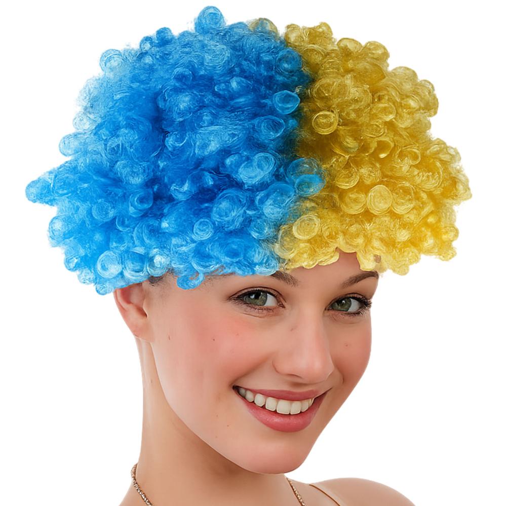 Sverigeparykk Gul/Blå omfatter en krøllete parykk i afro-stil med et tofarget design, der den ene siden er lyseblå og den andre gul.