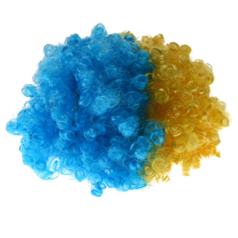 Med denne discoparykken blir du kveldens snakkis. Som afroparykk er den gul, med blå partier, og setter fart på både dansegulvet, tribunen og hele heiagjengen. Som krøllete parykk er den også gul, med blå partier, og like iøynefallende.