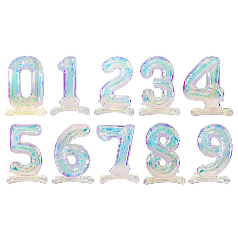Tallballong Skimrende Stående 72 cm er en stående folieballong i form av et regnbueskimrende tall som fylles med luft med det medfølgende blåserøret.