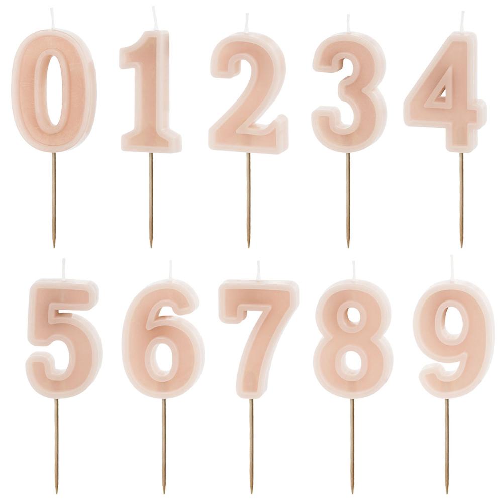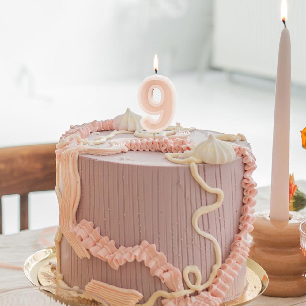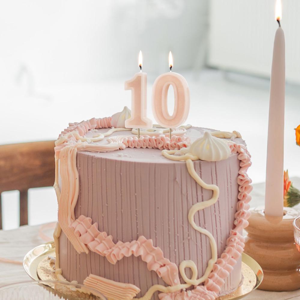 Tallys Støvrosa omfatter et kakelys i form av et tall i støvrosa farge.