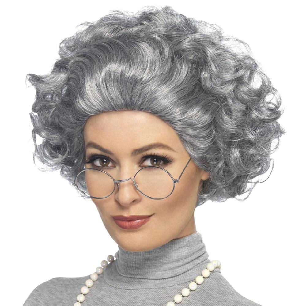 Tante Parykksett Grå omfatter en kort og krøllete tante-parykk i en sølvgrå farge, et par runde briller og et perlekjede.