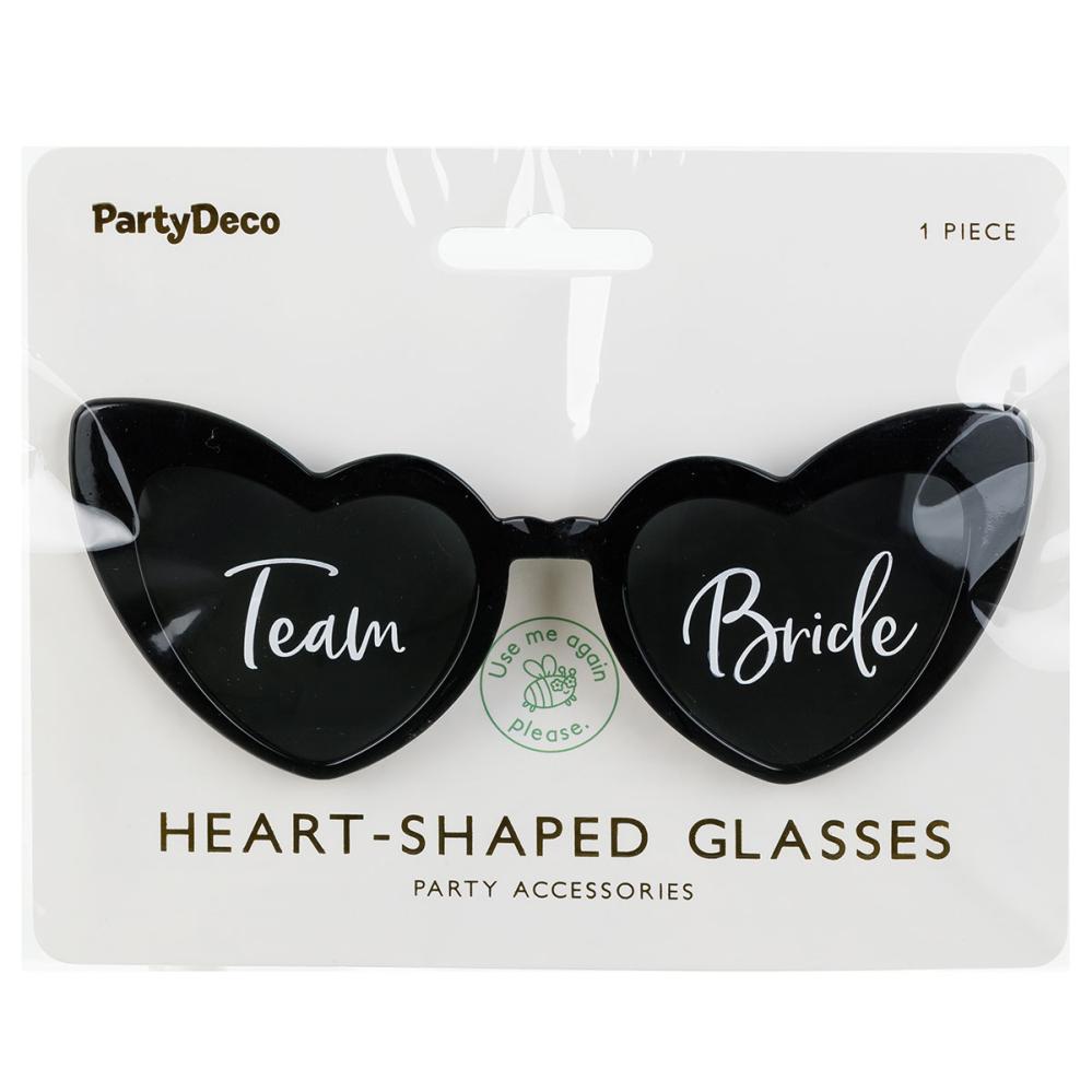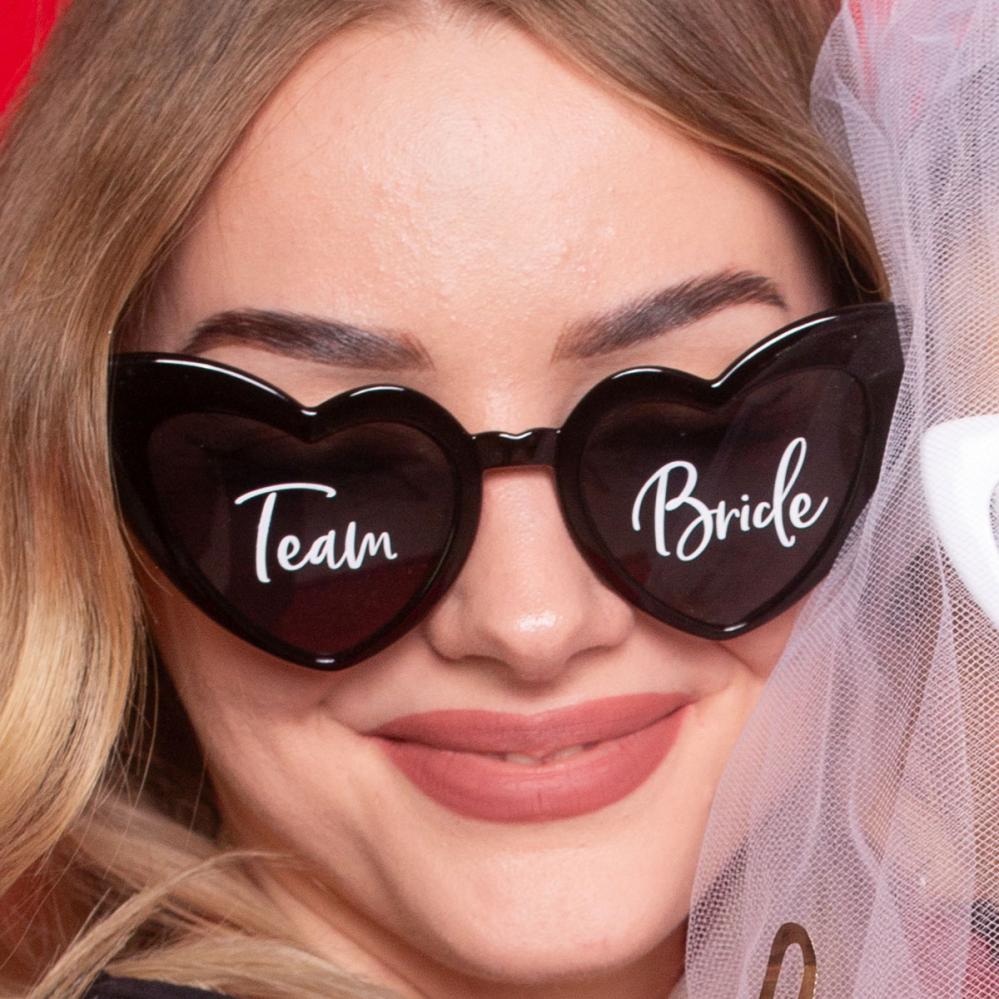 Team Bride Hjerteformede Briller består av et par svarte, hjerteformede briller med mørktonede linser samt teksten 'Team' og 'Bride' i hvitt på hver sin linse. Merk at brillene ikke beskytter mot UV!
