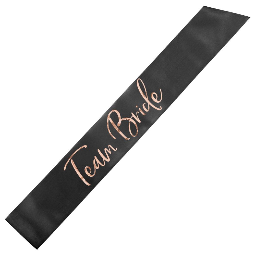 Team Bride Ordensbånd Svart omfatter et svart ordensbånd med teksten 'Team Bride' i roségull.