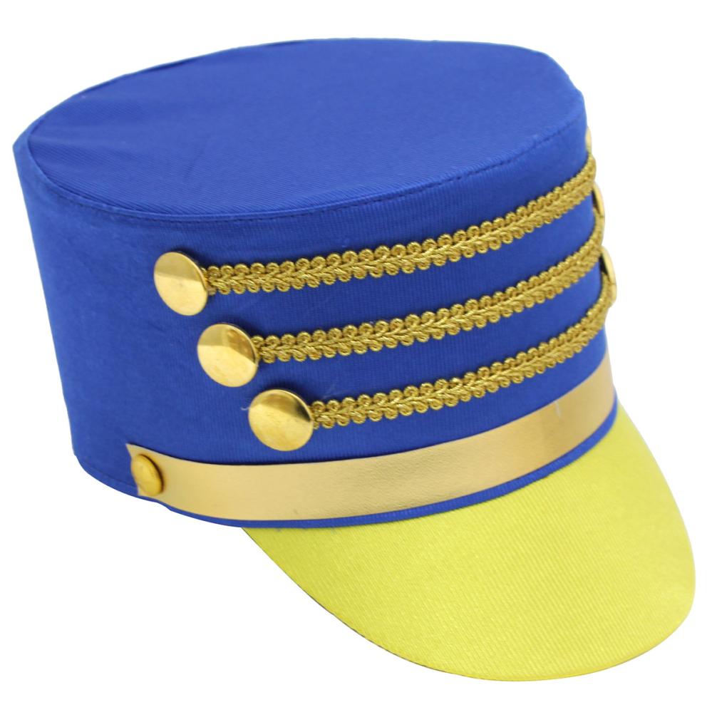Trommeslagerhatt Blå/Gul omfatter en blå paradehatt med en gul skjerm og dekorative gulldetaljer i form av knapper og snirklete bånd.