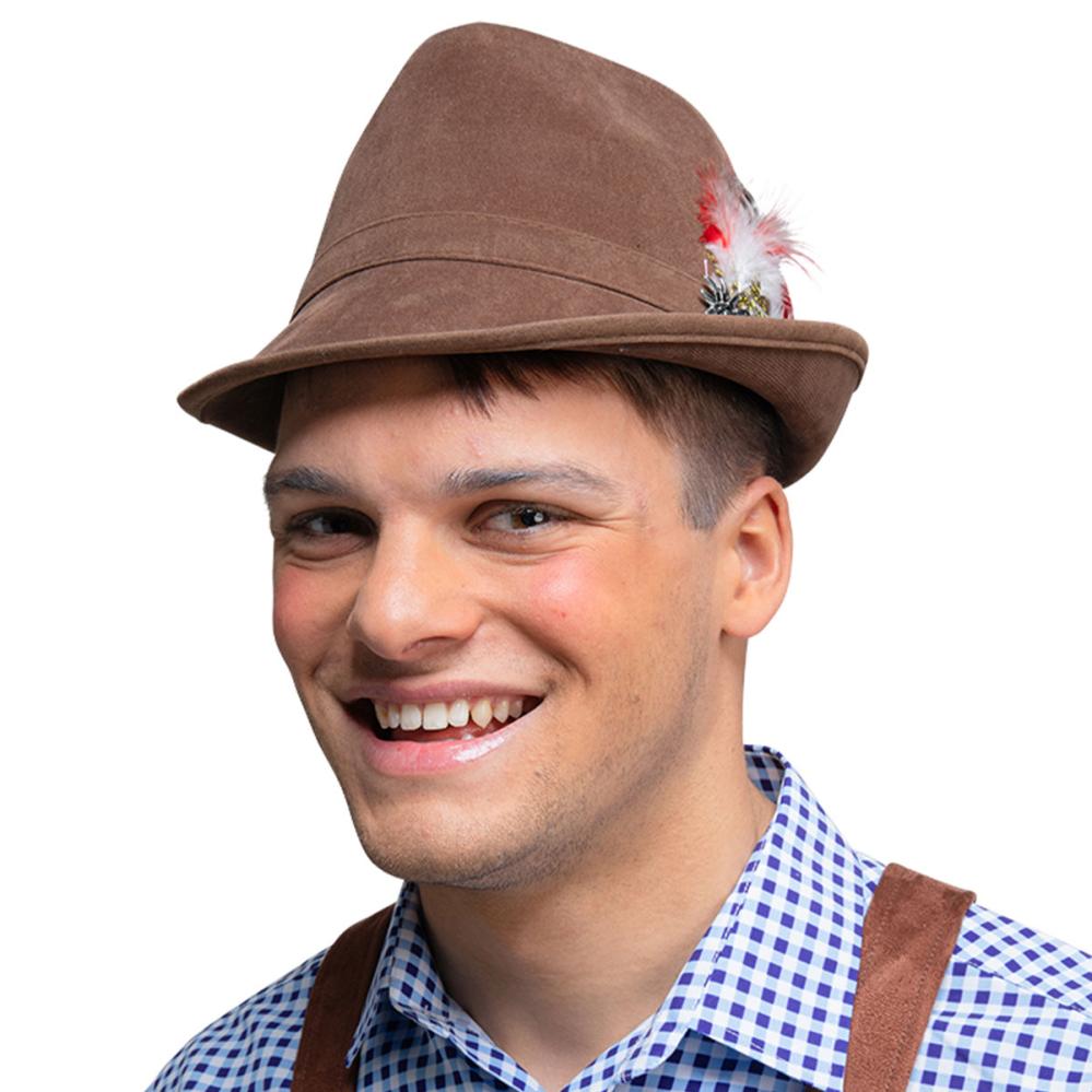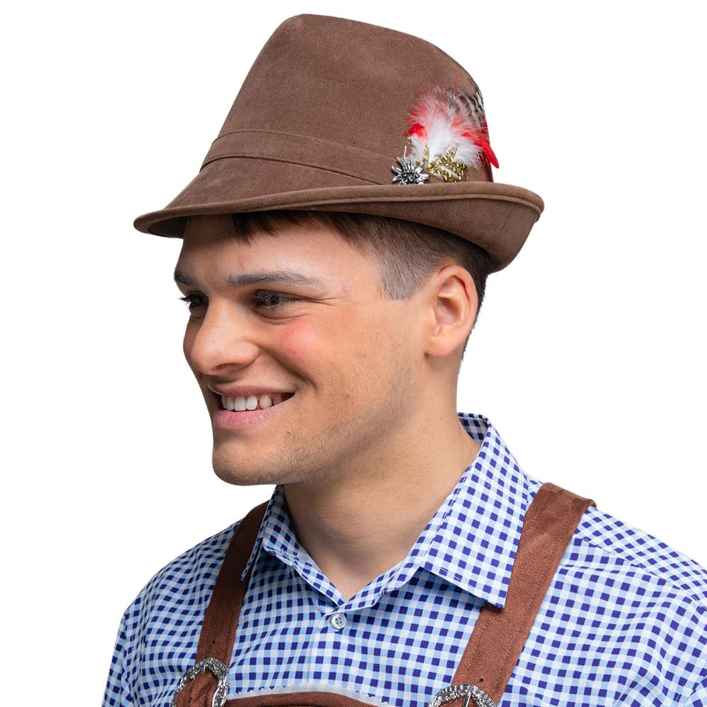 Tyrolerhatt Bayersk Brun omfatter en brun Oktoberfest hatt med fjær i blandede farger på den ene siden, en sølvfarget spenne samt et brunt bånd rundt hatten. Fjærene er røde, svarte og gulprikkete, brune og hvite samt grønne og hvite.