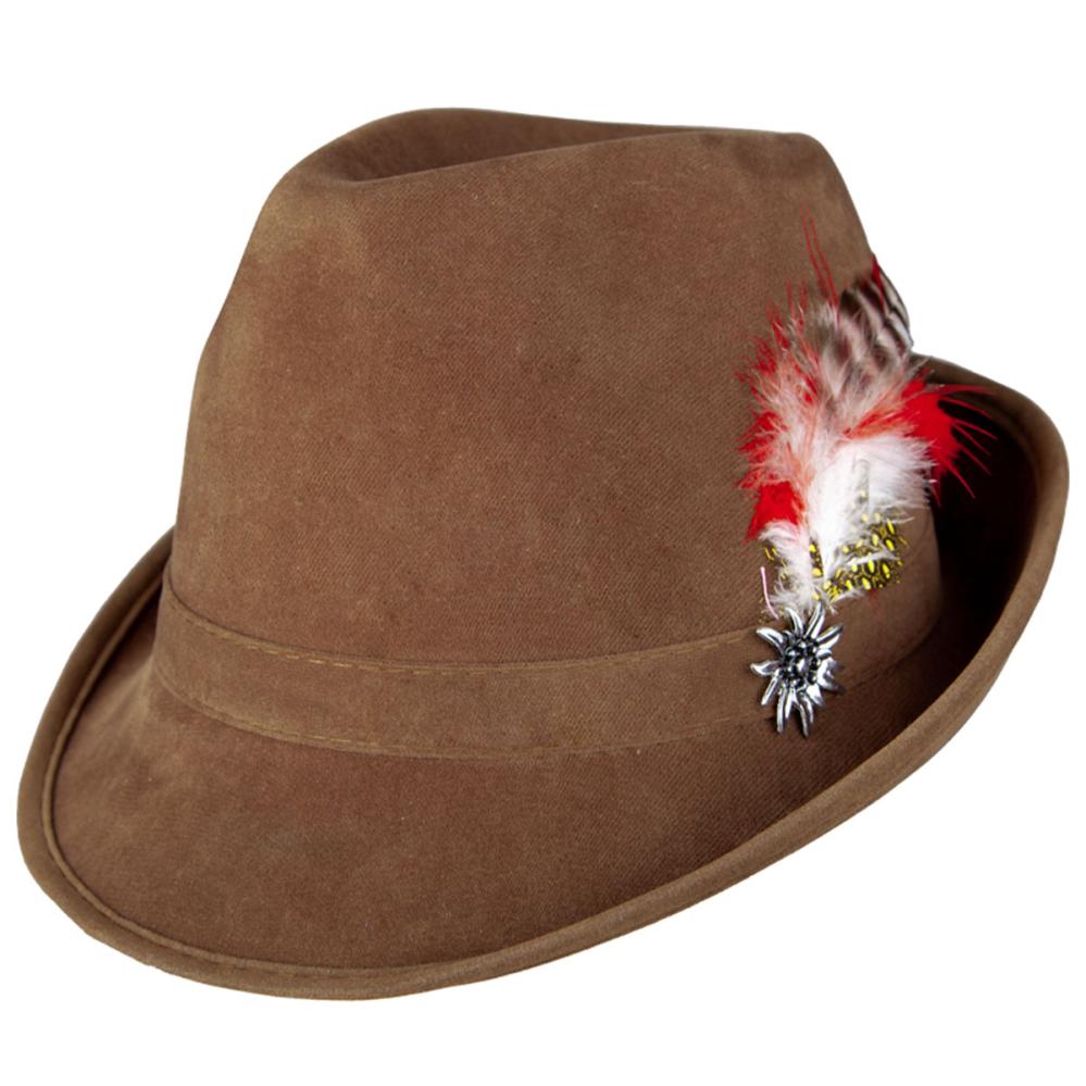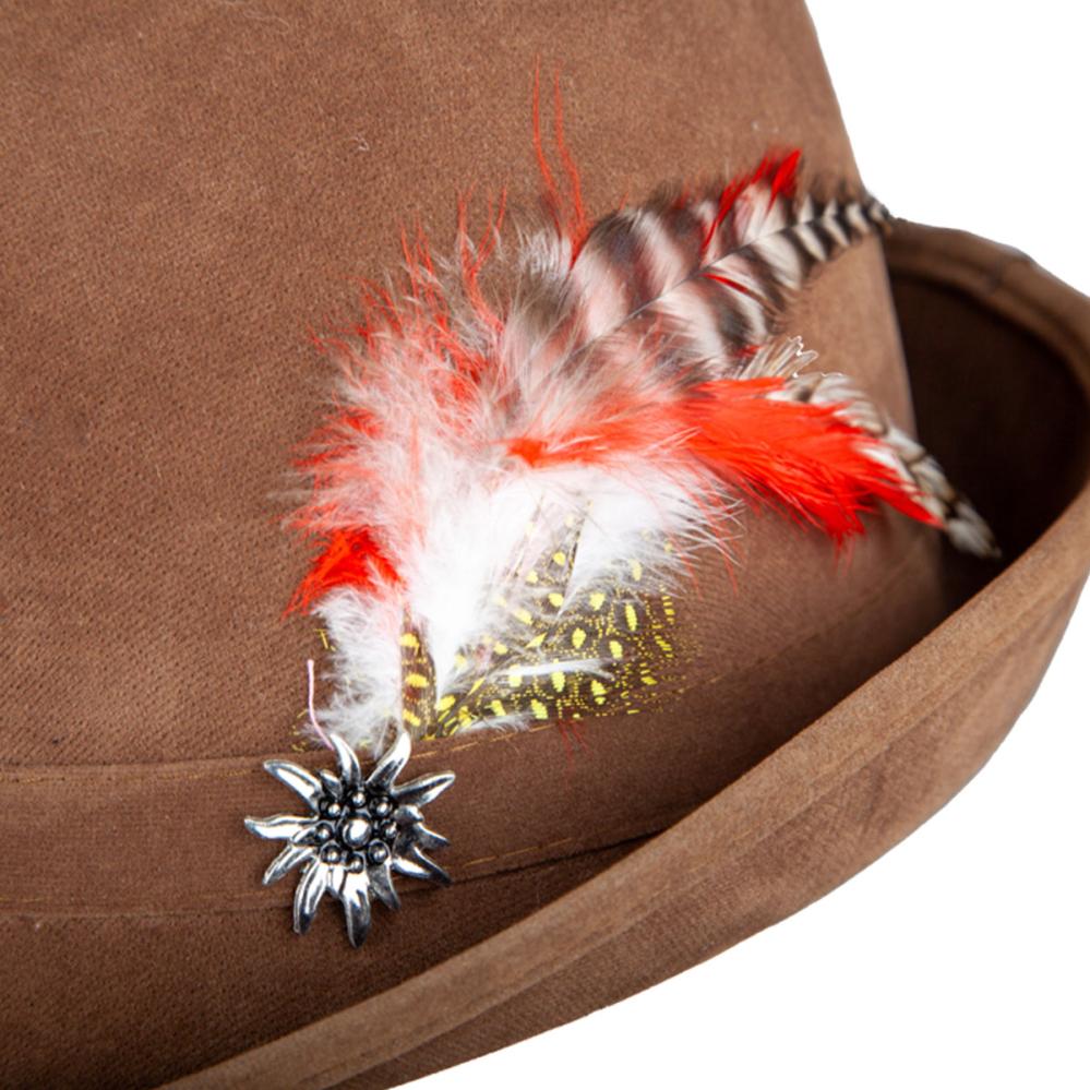 En bayersk hatt som kombinerer tradisjon og farge med sine prydelige fjær og en dekorativ spenne. En perfekt tyrolerhatt for fest, særlig som en Oktoberfest hatt med ekte sørtysk karakter og stil.