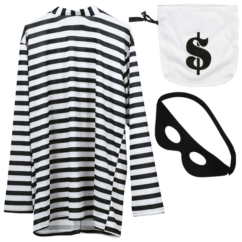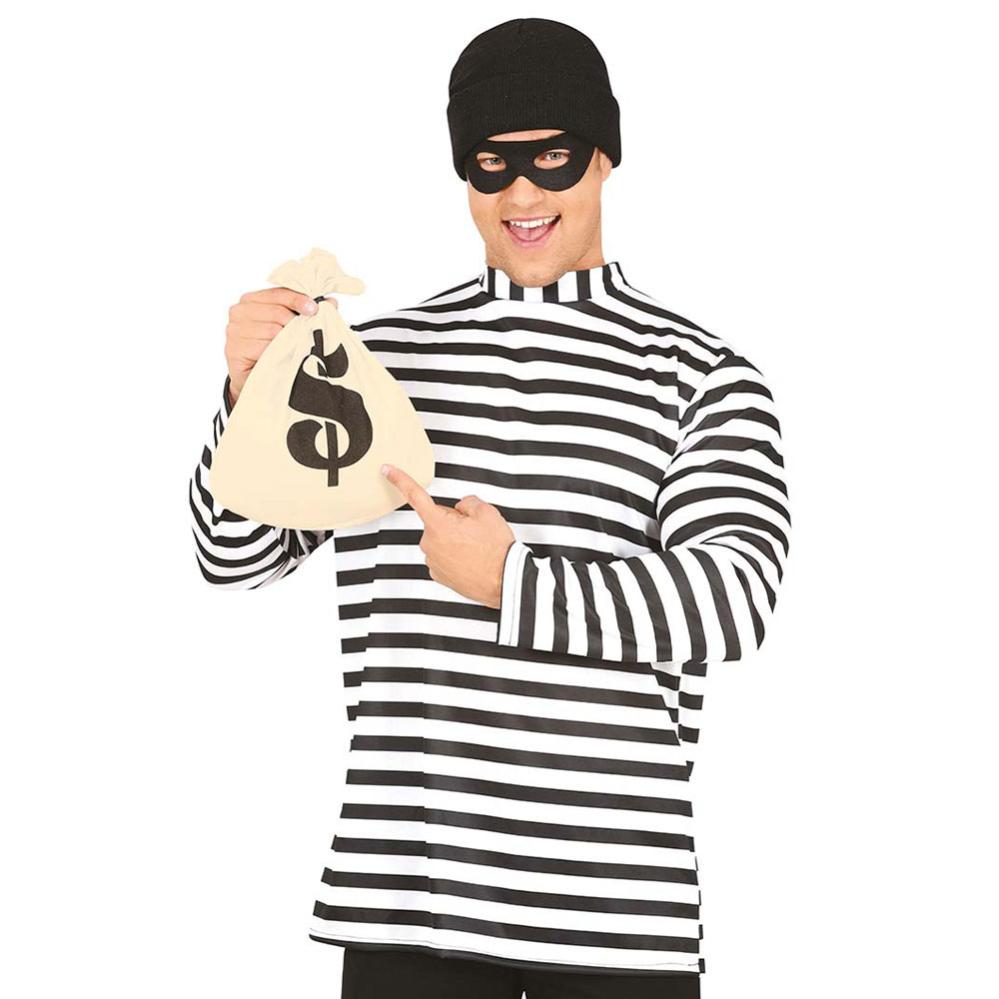 Tyv Kostyme omfatter et kostyme med motiv av en tyv. Drakten inkluderer en svart tyvmaske, en stripete genser i svart og hvitt samt en elfenbenshvit pengesekk med et svart dollartegn på.
