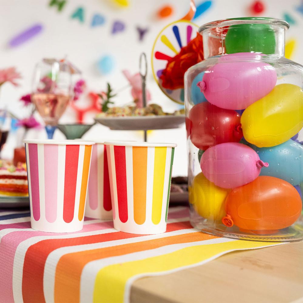 Her skjuler det seg 50 herlig sprelske ballonger til sommerens våteste latterfest. Disse vannballongene byr på lekne dueller på gårdsplassen og fargesprut som får hele gjengen til å juble. De passer til lek i hagen eller parken når solen frister.