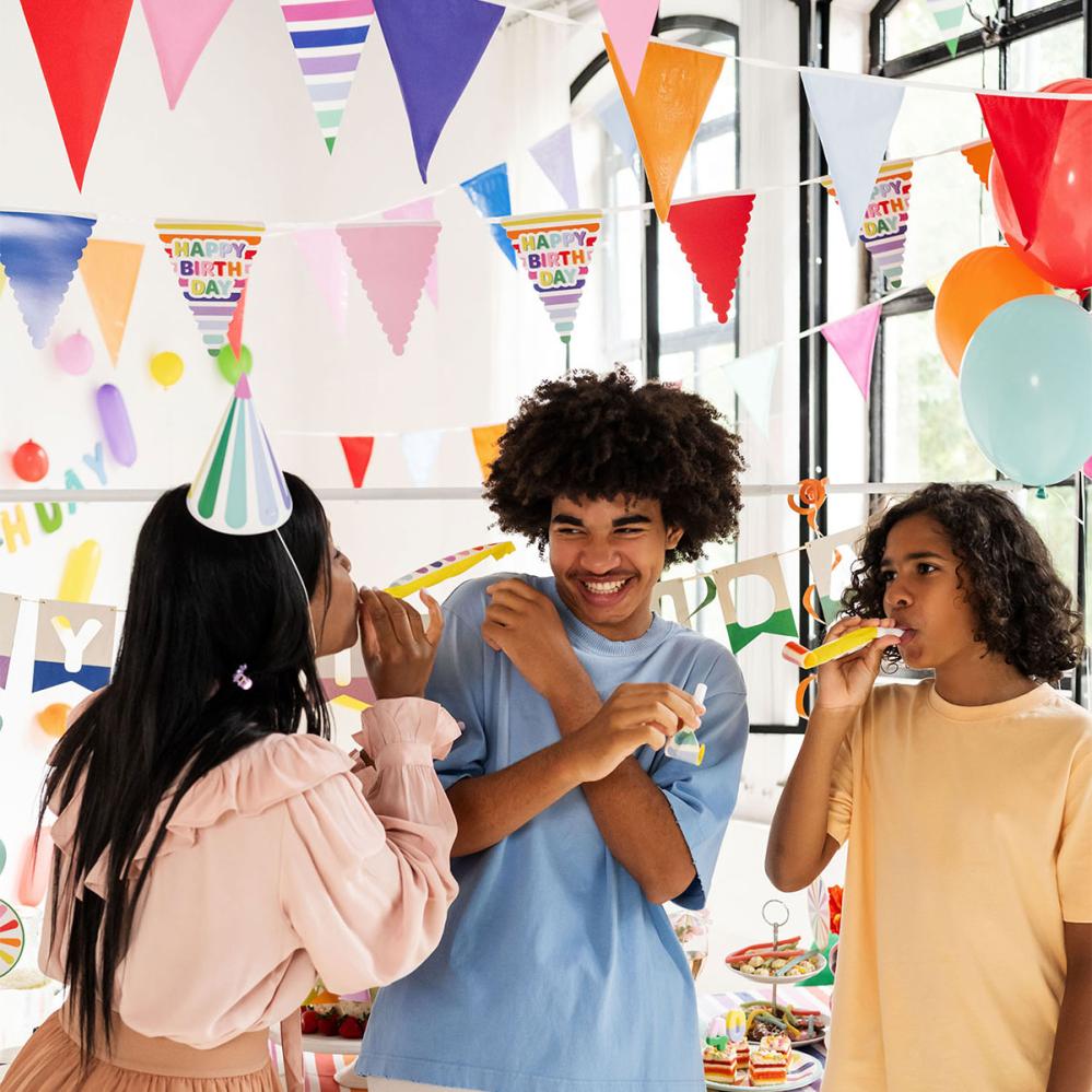 Förhøy stemningen med en fargesprakende flaggirlander i 6 meters lengde. Perfekt som hengende dekorasjon til fest, med plass til ti fargerike flagg. Enkel å pakke sammen og gjenbruke blant dine beste festdekorasjoner.