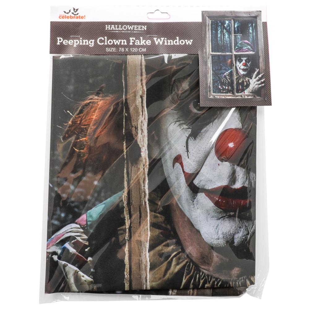 Vinduspynt Halloween Skummel Klovn består av en stoffdekorasjon med motiv av en skummel klovn mot en naturbakgrunn. Dekorasjonen henges på innsiden av vinduet med motivet inn og skaper illusjonen av at klovnen titter inn gjennom vinduet.