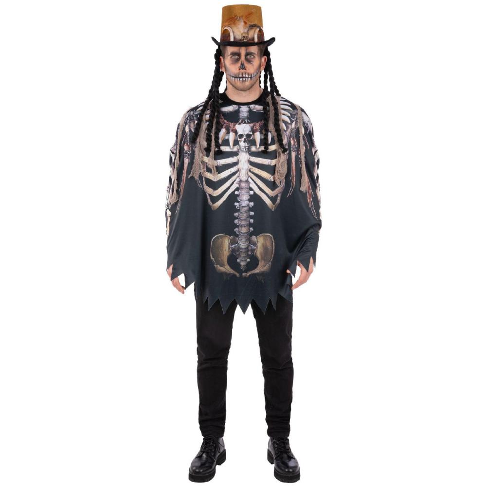 Voodoo Heksedoktor Poncho omfatter en svart poncho med taggete nederkant, med motiv av et hvitt skjelett samt diverse voodoo-smykker.