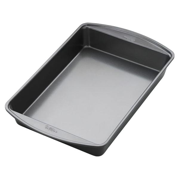 Wilton Cake Pan består av en rektangulær bakform laget av metall med non-stick belegg. Formen måler innvendig omtrent 32,5 centimeter i lengde og 22,5 centimeter i bredde. Kan vaskes i oppvaskmaskin.