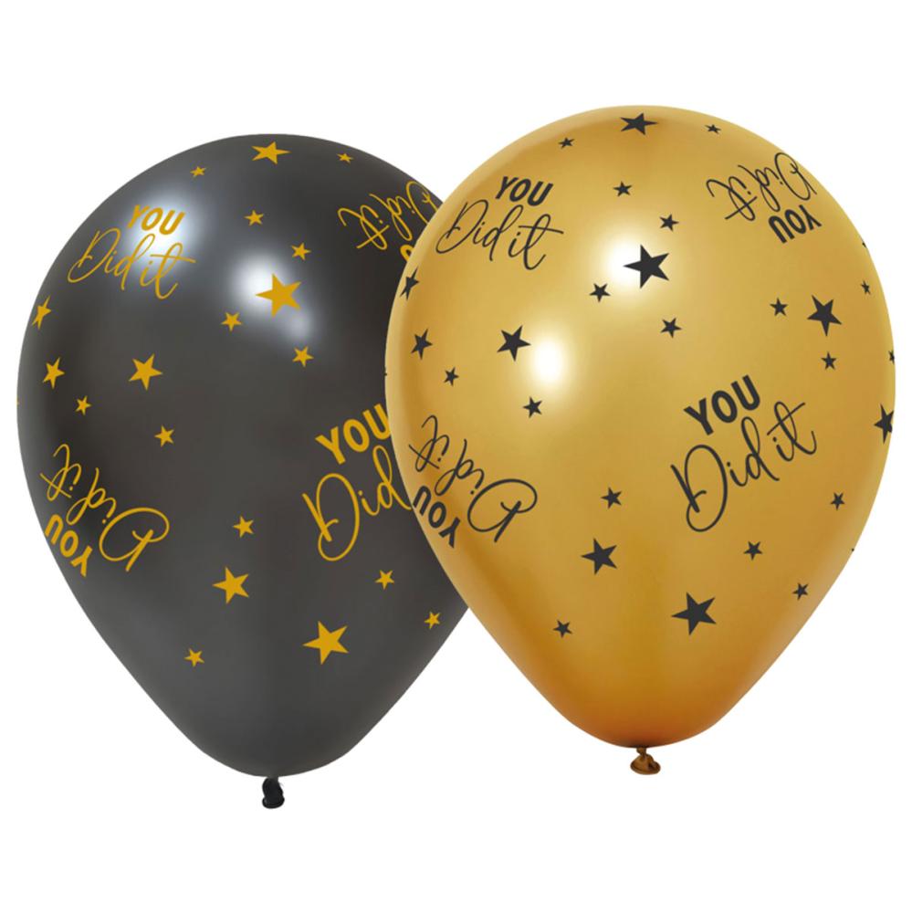 You Did It Latexballonger med Stjerner 6-pakning inneholder seks latexballonger hvorav tre har stjerner og teksten ”You Did It” i svart på gullfarget bakgrunn og de andre tre har samme motiv i omvendte farger.